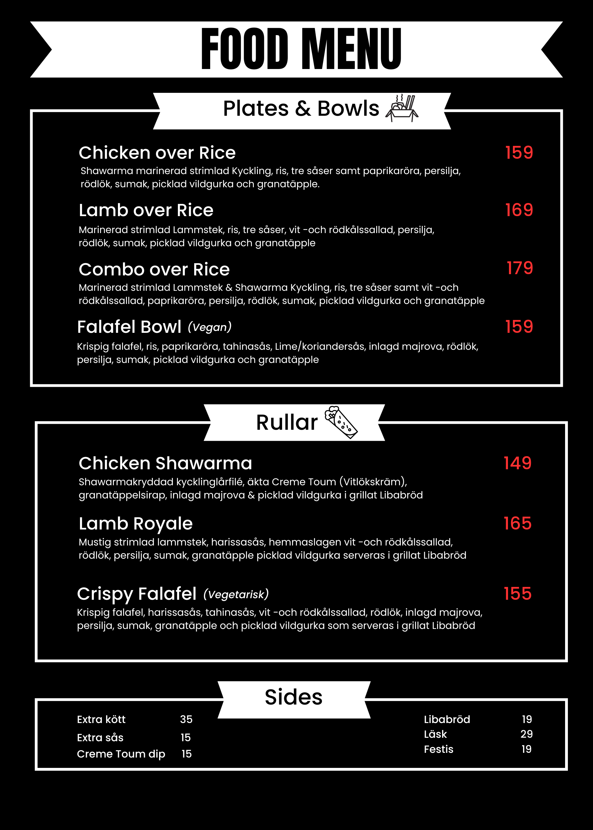 Vi specialiserar oss på libanesisk street food, lagad från grunden med rika smaker, rätterna är vi har tre risrätter, en vegansk rätt och 3 stycken rullar, less in more...